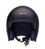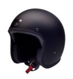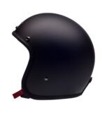 Hedonist Coal is the open face helmet for the strong silent type featuring matt black paint finish and hand-stitched black natural calf leather trim and lining on a lightweight composite shell of fibreglass and carbon fibre with 360° cushion padding, Merlin anti-bacterial fabric and anodized gunmetal-coloured brass hardware and matching brass buckle.